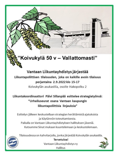 Kevätkokous maanantaina 26.5.2025 alkaen klo 18 Tikkurilan uimahallin kokoustilassa. 12.5.2025 Vantaan liikuntayhdistyksen sääntömääräinen kevätkokous maanantaina 26.5.2025 alkaen klo 18